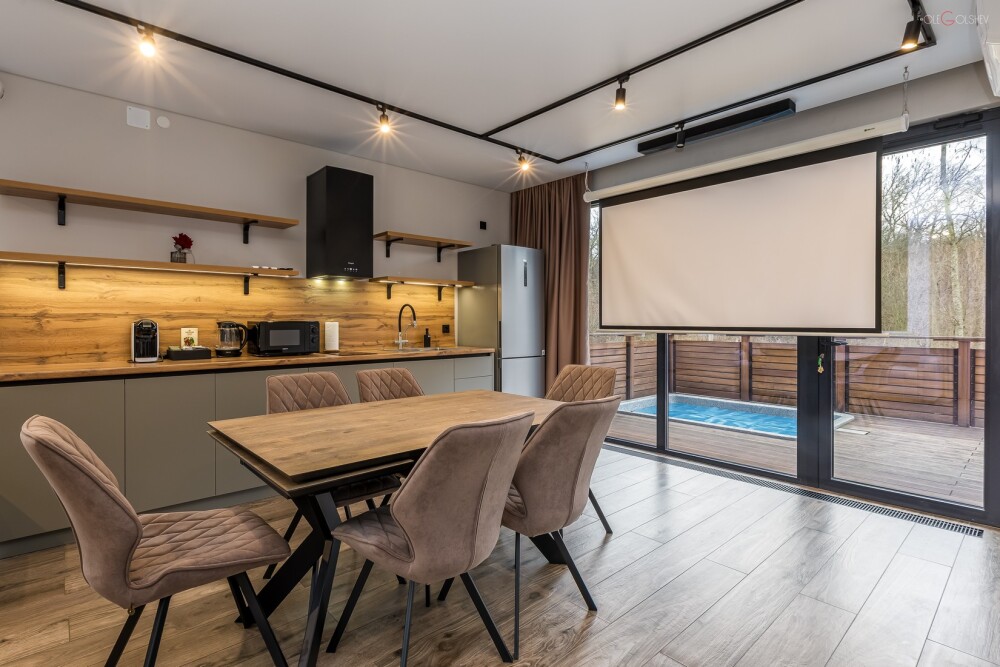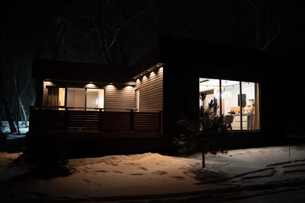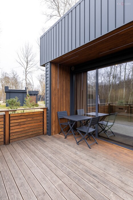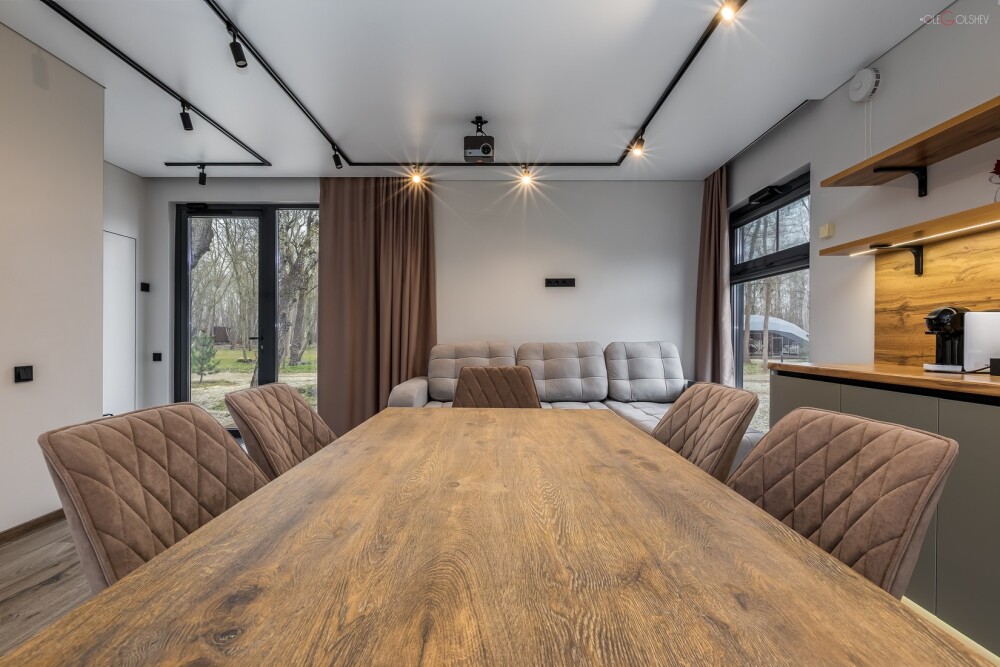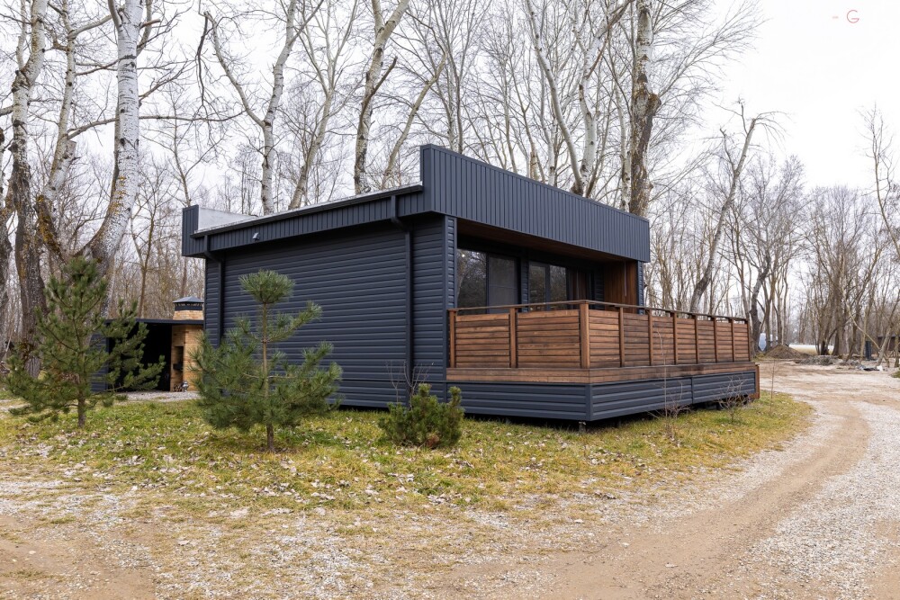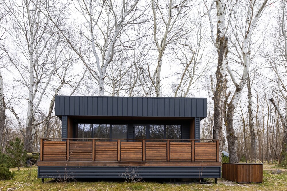Дома рассчитаны на двоих и четверых человек, включают в себя кухню-гостиную с двуспальной кроватью, ванную комнату и просторную террасу с обеденной зоной, джакузи и гамаком. Дом оснащен мангальной зоной. Через панорамные стены дома открывается потрясающий вид на реку и лес. В доме есть мини кухня с рабочей поверхностью и навесными шкафами. Техническое оснащение кухни: холодильник, капсульная кофемашина, микроволновая печь, чайник, кулер с питьевой водой, посуда, столовые приборы и бокалы.
