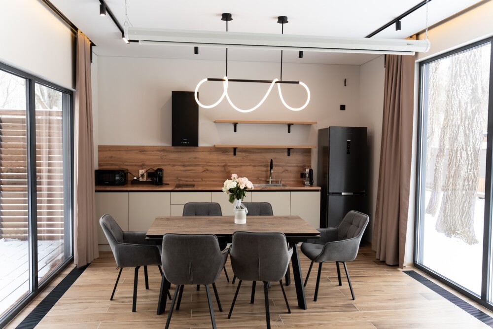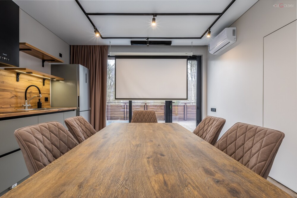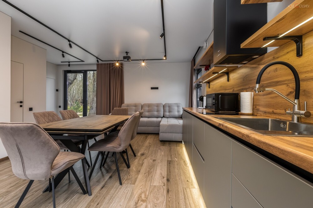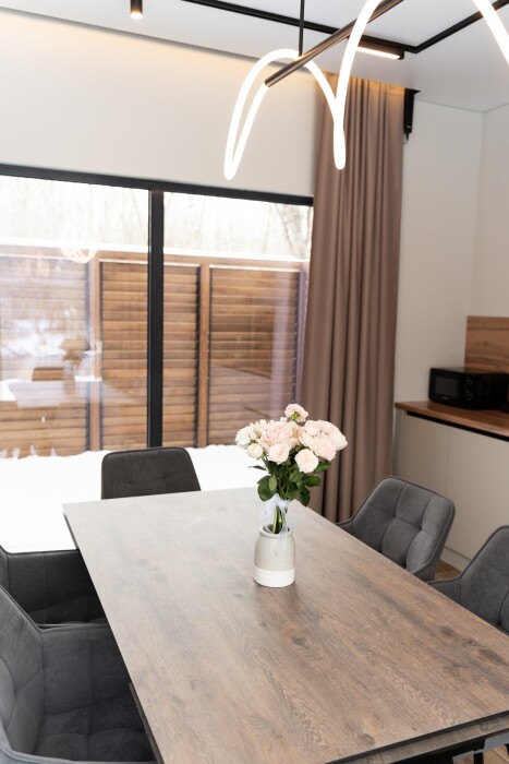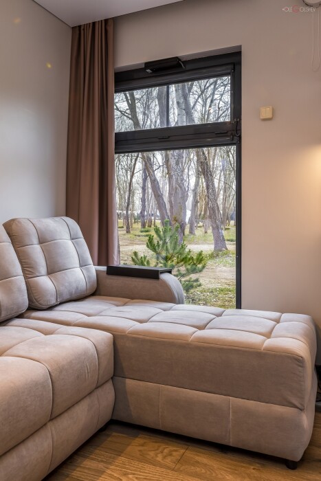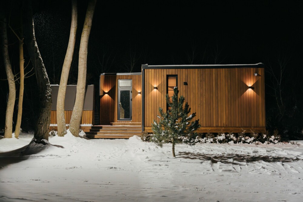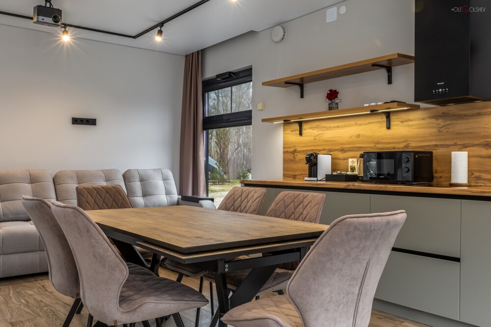 Дома рассчитаны на двоих и четверых человек, включают в себя кухню-гостиную с двуспальной кроватью, ванную комнату и просторную террасу с обеденной зоной, джакузи и гамаком. Дом оснащен мангальной зоной. Через панорамные стены дома открывается потрясающий вид на реку и лес. В доме есть мини кухня с рабочей поверхностью и навесными шкафами. Техническое оснащение кухни: холодильник, капсульная кофемашина, микроволновая печь, чайник, кулер с питьевой водой, посуда, столовые приборы и бокалы.