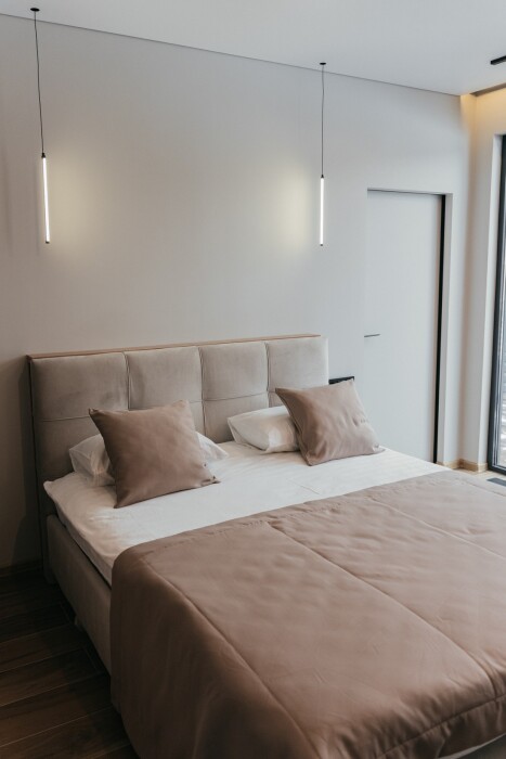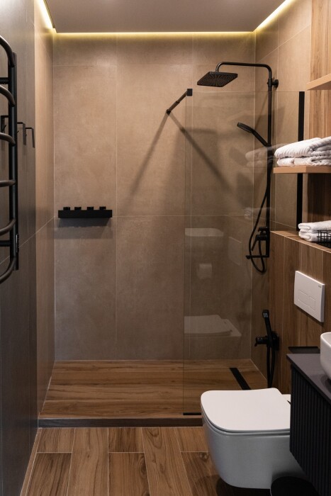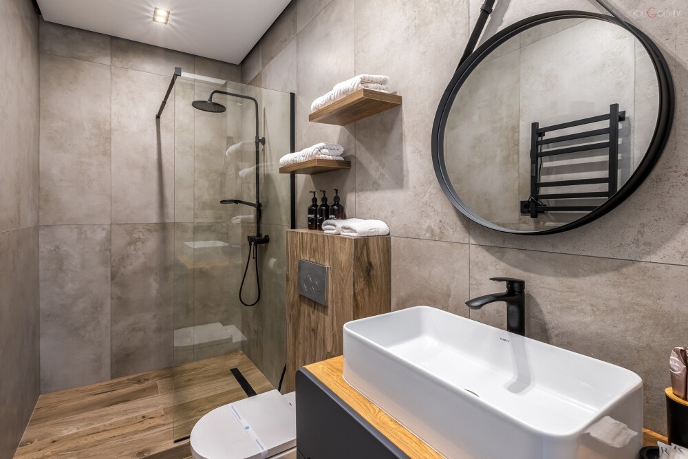 Дом с собственной мини кухней, спальней с приятным интерьером и ванной комнатой с панорамными стенами.