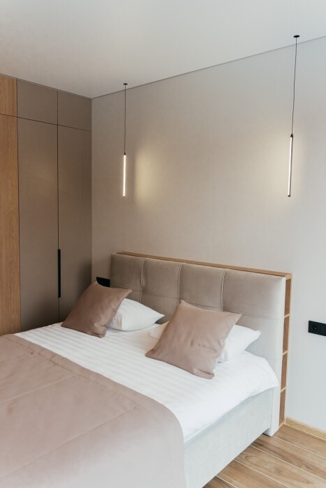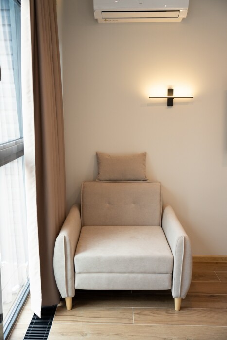 Имеется телевизор, кондиционер, шкаф, зеркало, обеденный стол, стулья, антимоскитная сетка и плотные шторы на пульте управления.