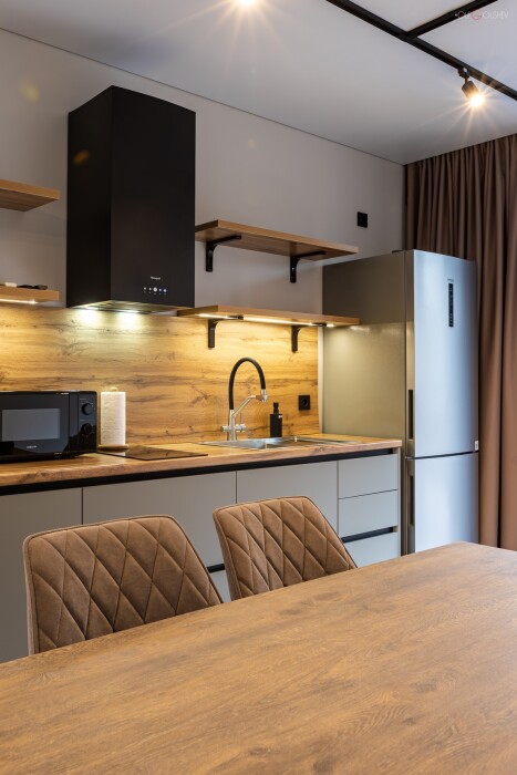 Кухня оборудована: СВЧ, чайник, холодильник, капсульная кофемашина, посуда и столовые приборы.