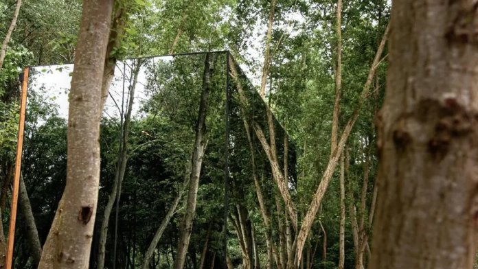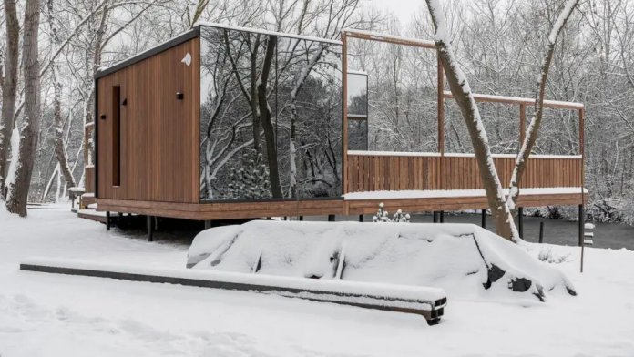 Зеркальный дом на берегу реки площадью 18 кв.м с видом на реку и лес.