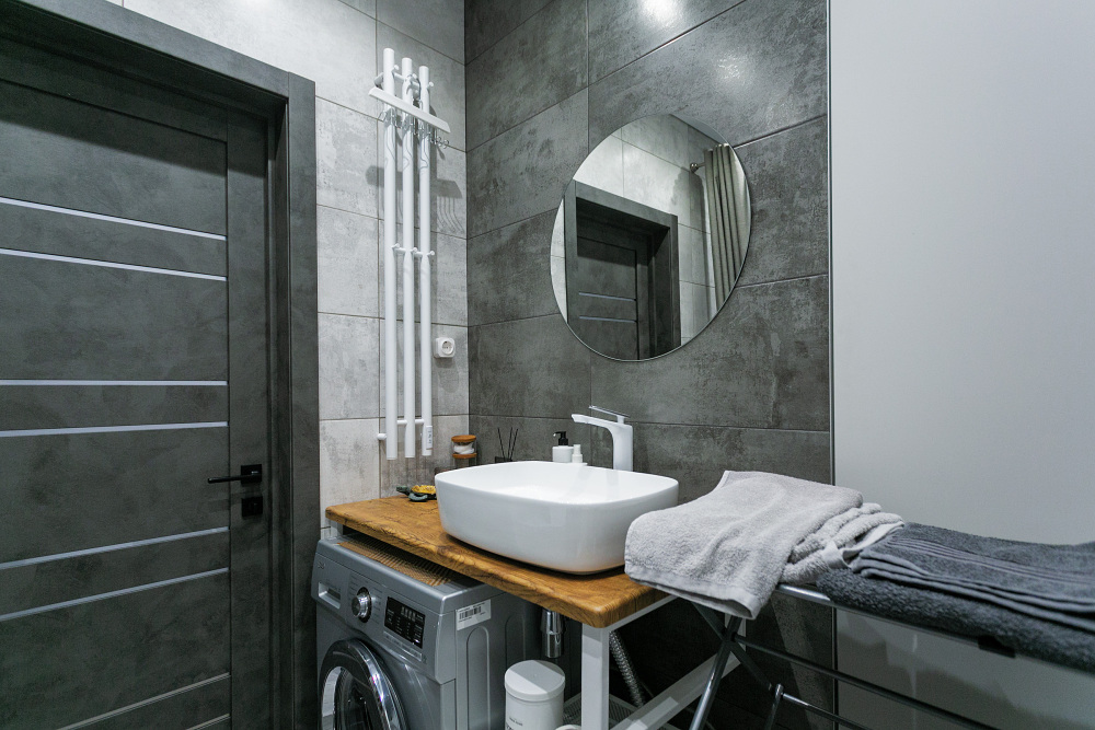 Ванная комната: ванная и душ, водонагреватель, стиральная машина, фен, щипцы - выпрямитель для волос, сушилка для обуви, комплект махровых полотенец, тапочки