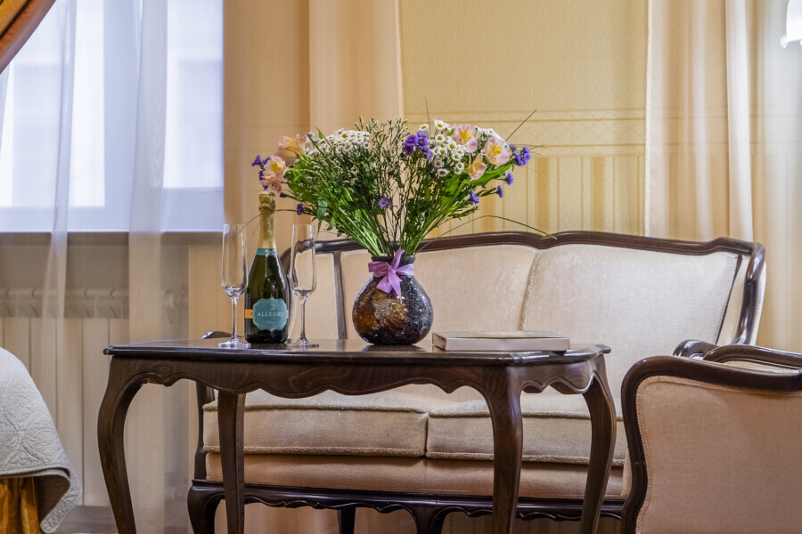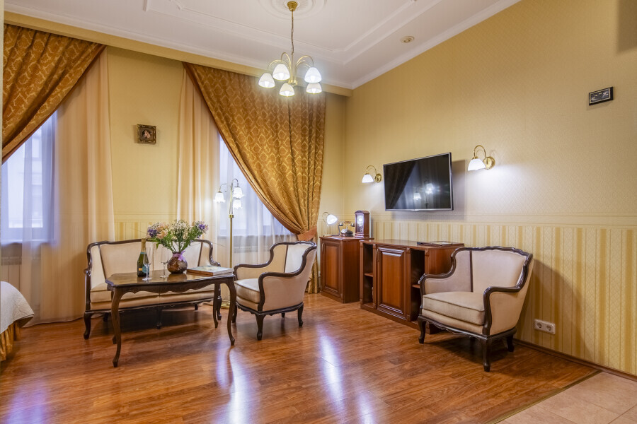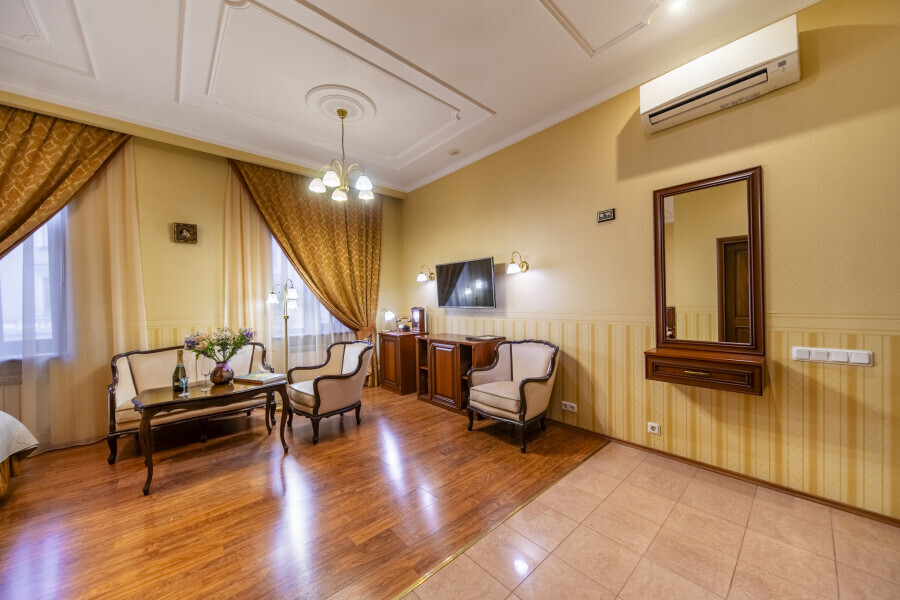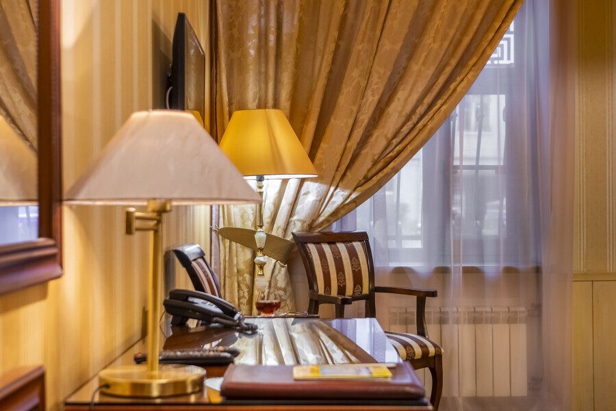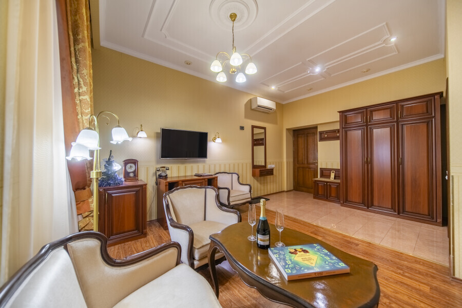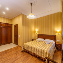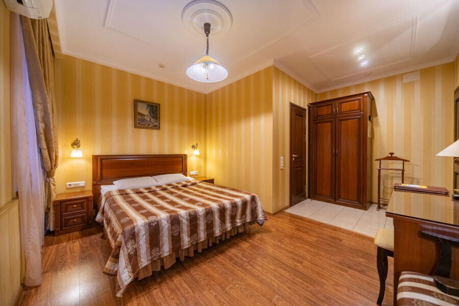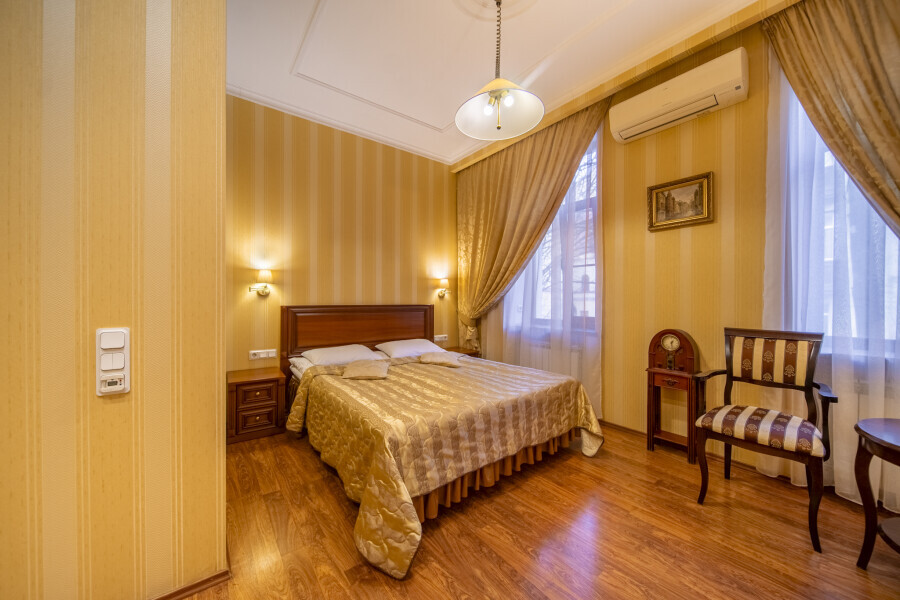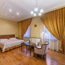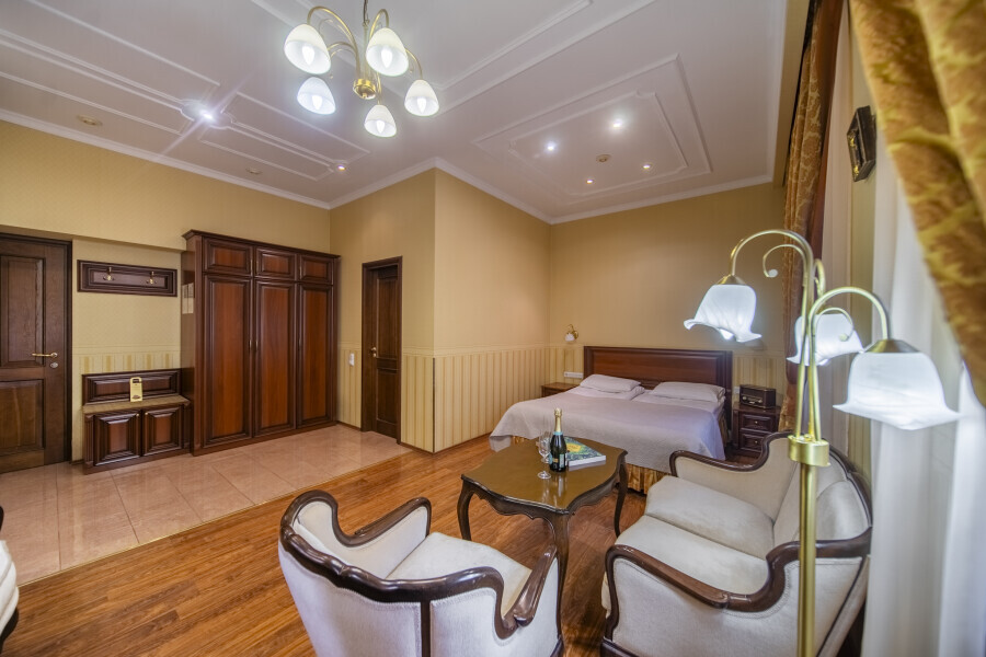 Элегантный номер в классическом стиле и теплых тонах, создающий ощущение комфорта и уюта. Антикварный уголок и старинная гравюра придают особый шарм номеру. Часто выбирается новобрачными или именинниками.