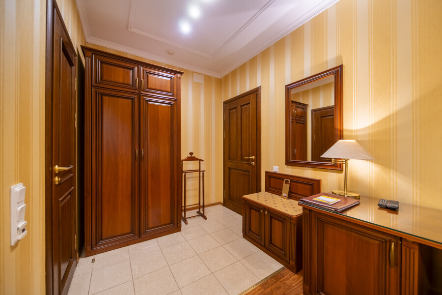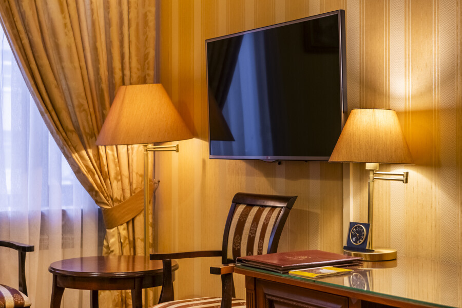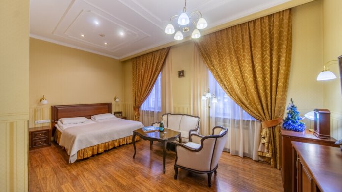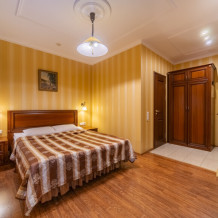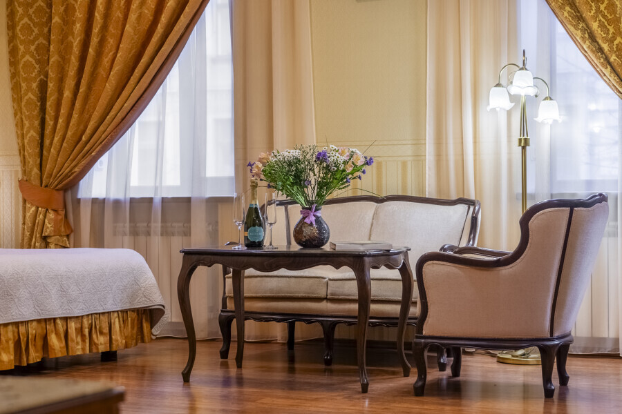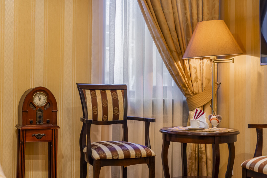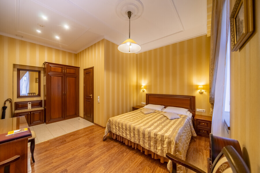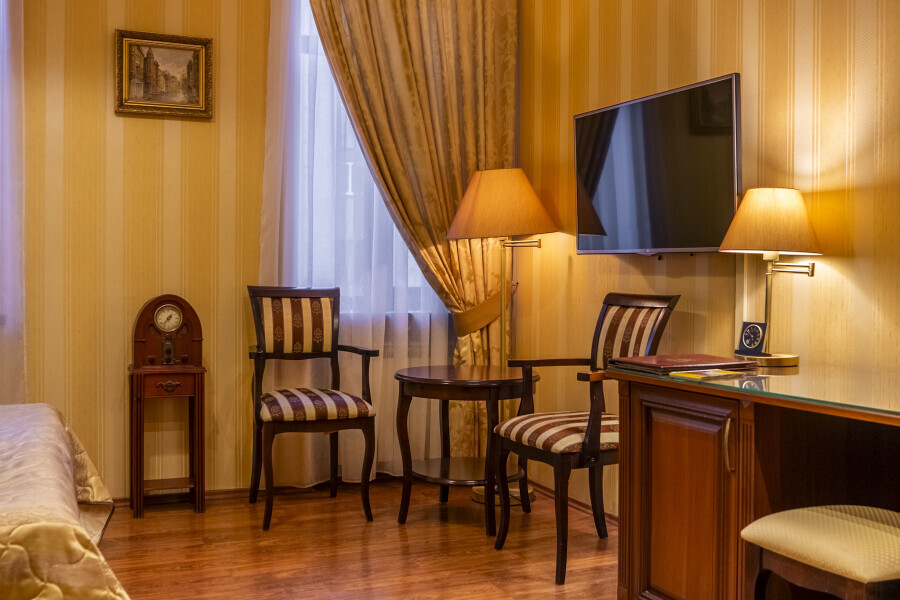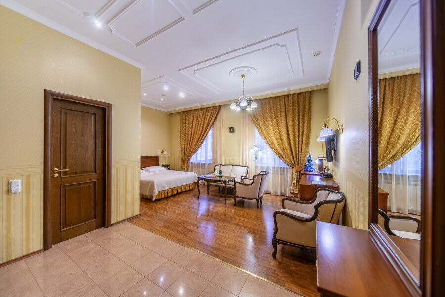 Элегантный номер в классическом стиле и теплых тонах, создающий ощущение комфорта и уюта. Антикварный уголок и старинная гравюра придают особый шарм номеру. Часто выбирается новобрачными или именинниками.