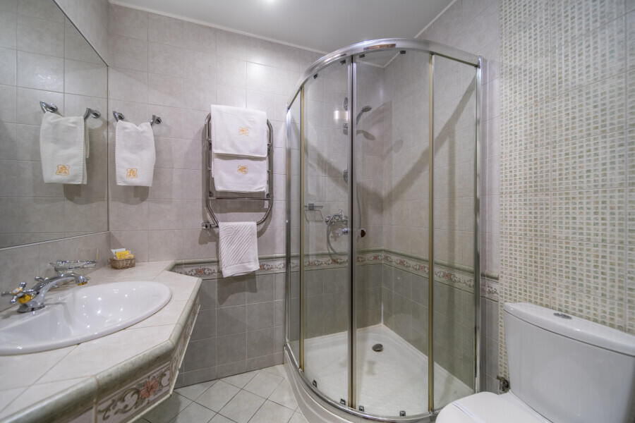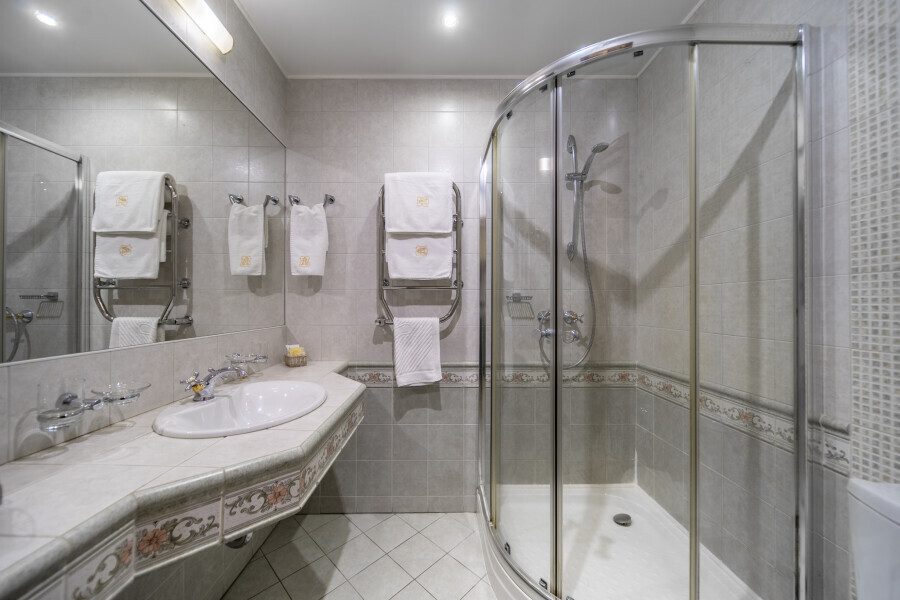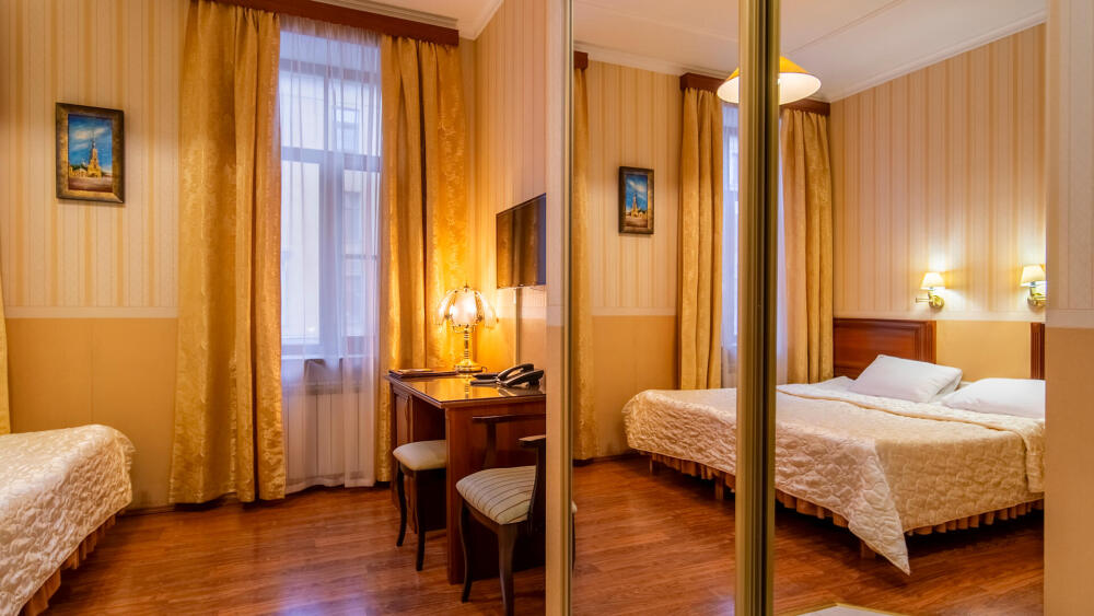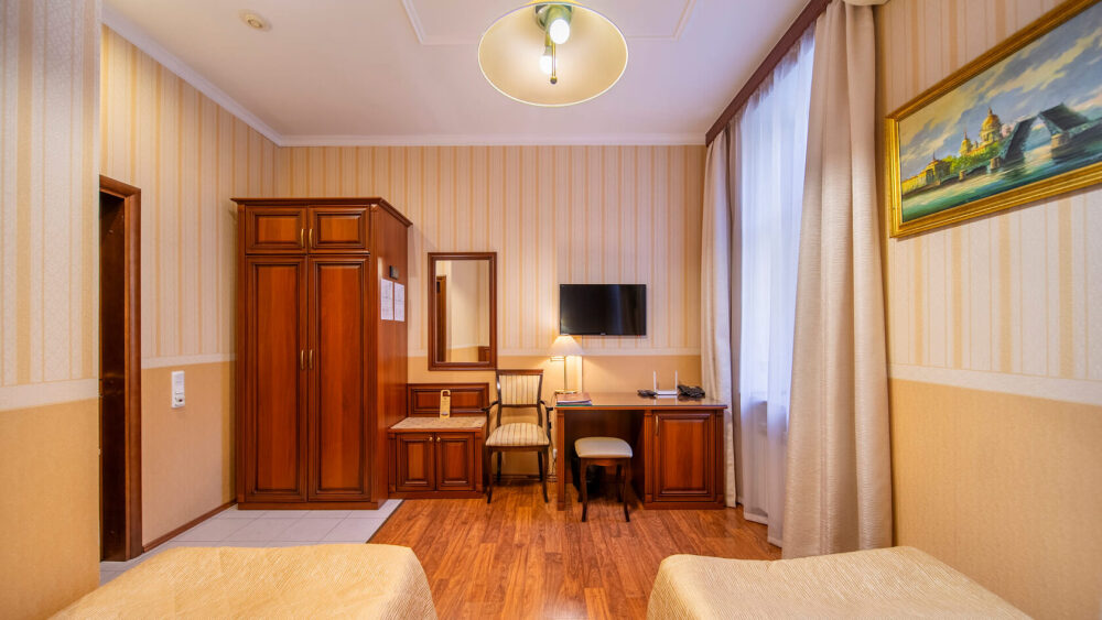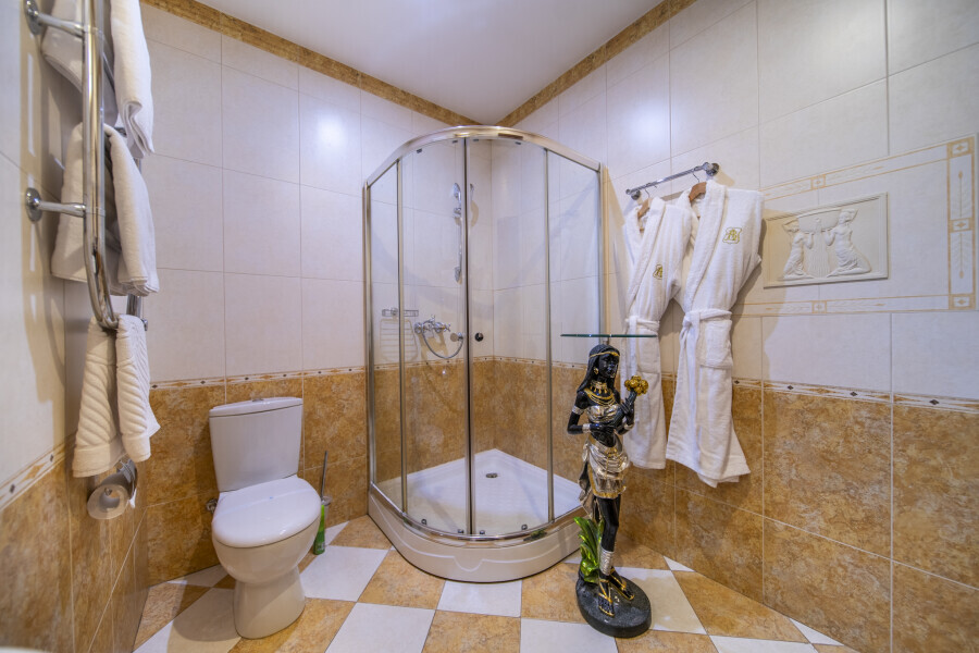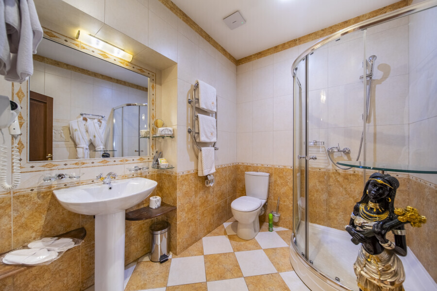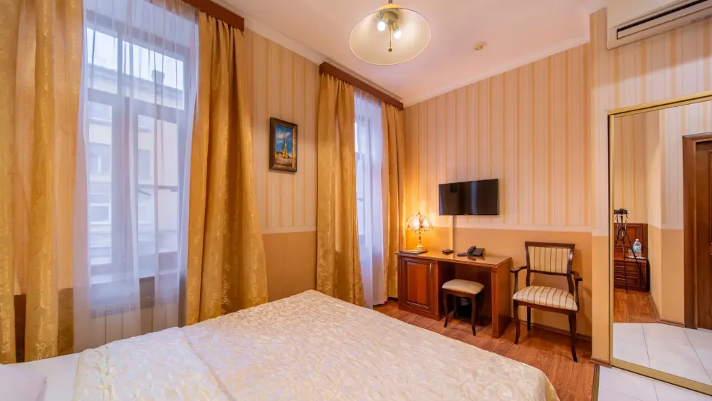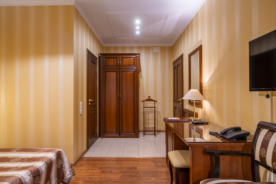 Элегантный номер в классическом стиле и теплых тонах, создающий ощущение комфорта и уюта. Антикварный уголок и старинная гравюра придают особый шарм номеру. Часто выбирается новобрачными или именинниками.