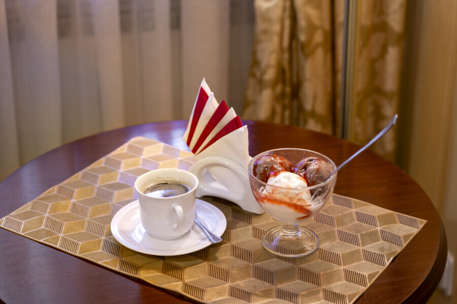 Утром будет предложен вкусный и сытный завтрак. В течении дня горячий кофе, чай, фирменный шоколад и мороженое - как комплимент отеля гостю.
