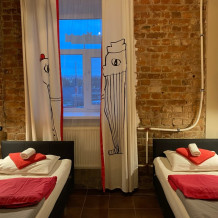 Номера с отсылками к кино-шедеврам, отдельные номера и места в общих четырехместных. Общая кухня, большая зона с проектором и xbox в Вашем распоряжении. Мы рады разместить гостей с животными.
