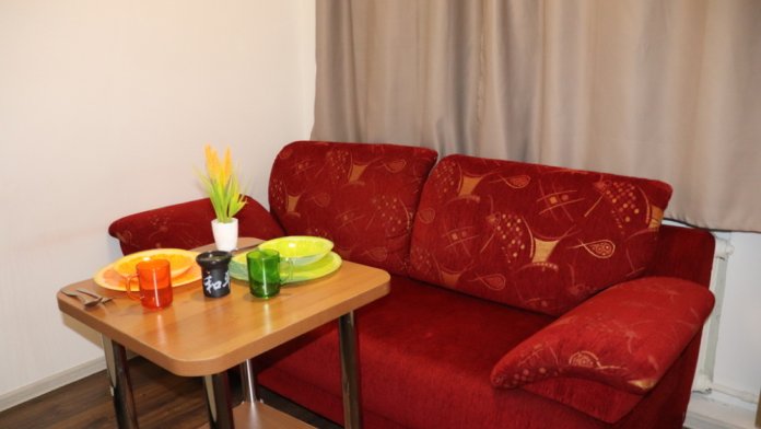 В комнате двуспальный раскладной диван, обеденный стол со стульями, встроенная кухня с мебелью, техникой, посудой и столовыми приборами. Интернет Wi-Fi, ЖК ТВ, глаженное постельное белье и полотенца. Санузел с душевой кабиной и стиральной машиной.