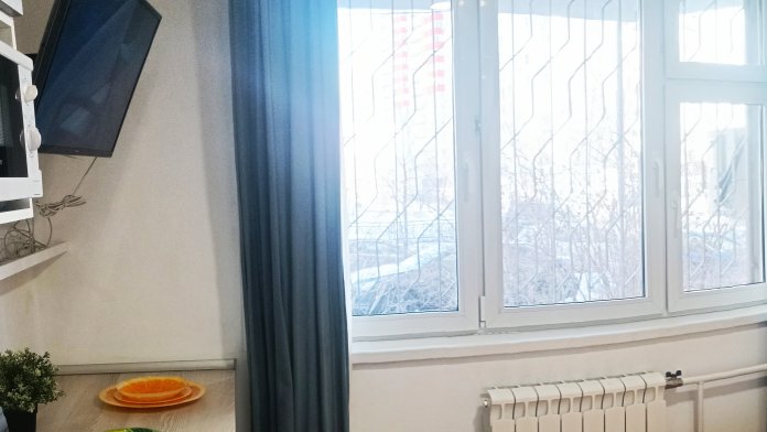 В комнате двуспальная кровать, обеденный стол со стульями, встроенная кухня с мебелью, техникой, посудой и столовыми приборами. Интернет Wi-Fi, большой SMART-TV на 150 каналов, глаженное постельное белье и полотенца. Санузел с душевой кабиной и стиральной машиной.