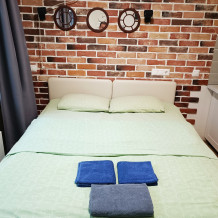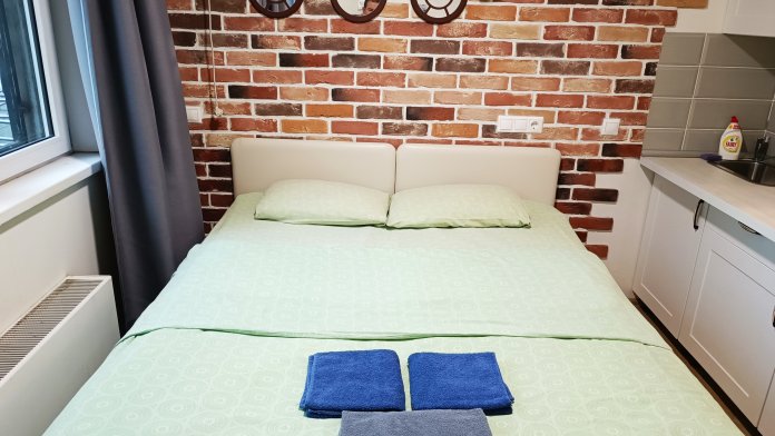 В комнате двуспальная кровать, обеденный стол со стульями, встроенная кухня с мебелью, техникой, посудой и столовыми приборами. Интернет Wi-Fi, большой SMART-TV на 150 каналов, глаженное постельное белье и полотенца. Санузел с душевой кабиной и стиральной машиной.
