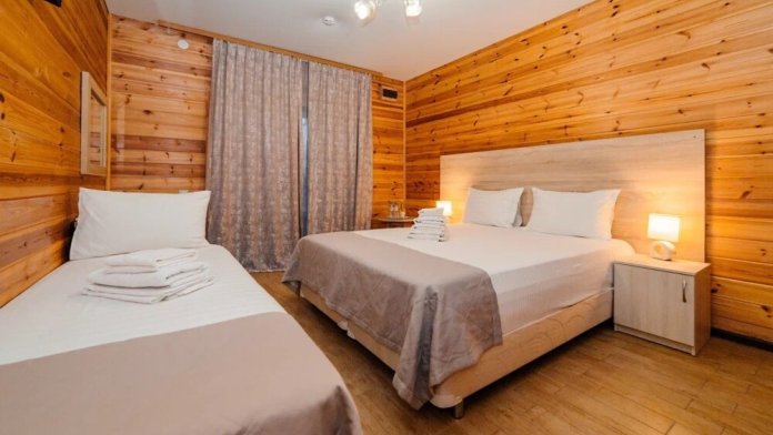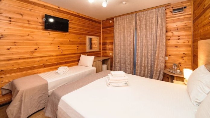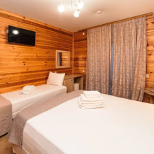 Трехместный номер из натурального дерева площадью 18 кв. метров с одной двуспальной и одной односпальной кроватями. Трехместные номера идеально подойдут для семейного отдыха. Расположены на 2 этаже.