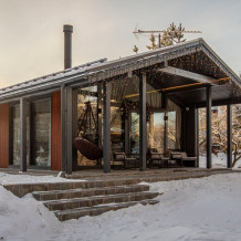 Уютный дом на 2 спальни антресольного типа. Одна отдельная на первом этаже и открытая спальня с прекрасным видом на лес на втором этаже. На первом этаже панорамная гостиная с камином и видом на озеро и лес.