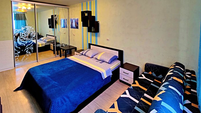 Апартаменты полностью оборудованы, есть все необходимое: кровать с комфортным ортопедическим матрасом, удобный раскладной диван, бесплатный Wi-fi, кабельное и смарт ТВ, кондиционер, вся необходимая посуда, чай, сахар, соль, перец, масло. Шампунь, гель для душа, мыло. Бытовая техника: стиральная машинка, микроволновка, плита с духовкой, эл.чайник, фен, гладильная доска, утюг.