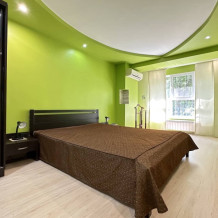 Третья комната совмещена с кухней и может послужить либо столовой, либо дополнительным спальным местом. Стиль комнаты яркий и неординарный. Просторные апартаменты способны вмещать до 4х человек.