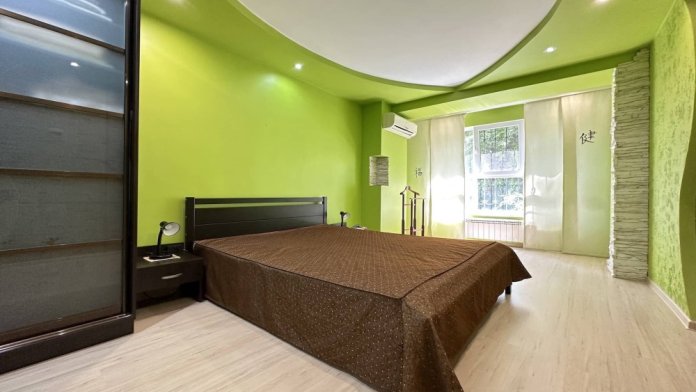 Первая просторная спальня выполнена в японском стиле минимализм. Приятные оттенки зеленого в отделке, простая, но функциональная и удобная мебель, широкая двуспальная кровать и огромное окно – все, что необходимо для отдыха после приятно проведенного дня.