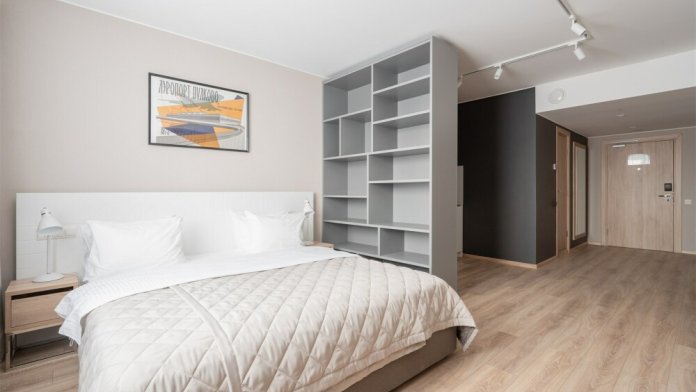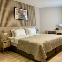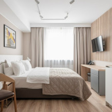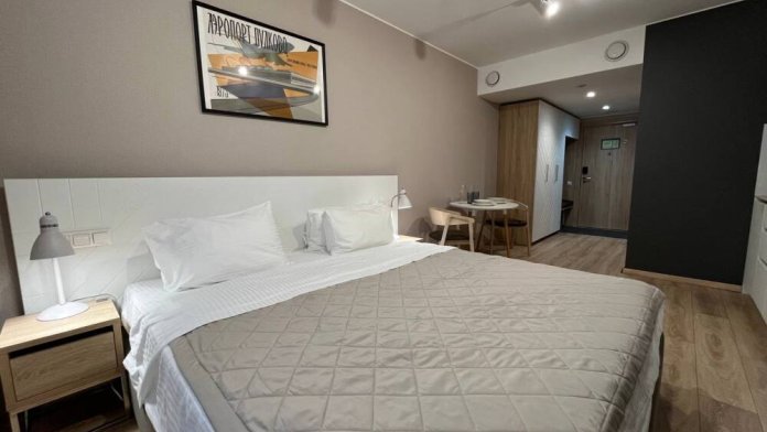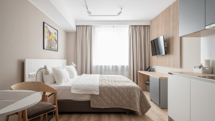В каждом номере есть все необходимое для комфортного проживания: кровать, рабочий стол, шкаф для одежды, телевизор, кондиционер, ванная комната со стиральной машиной, кухня со всей необходимой техникой и посудой. Предоставляются туалетно-косметические принадлежности.