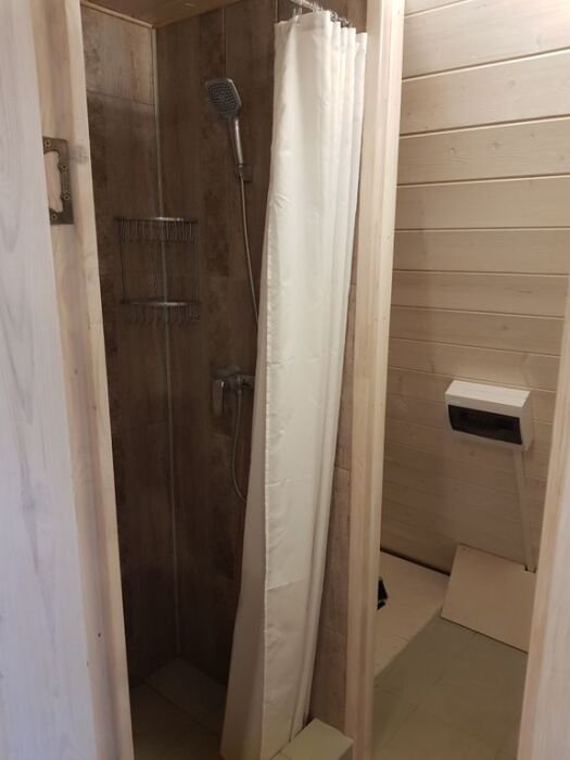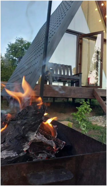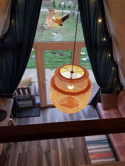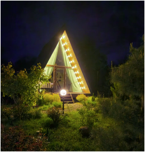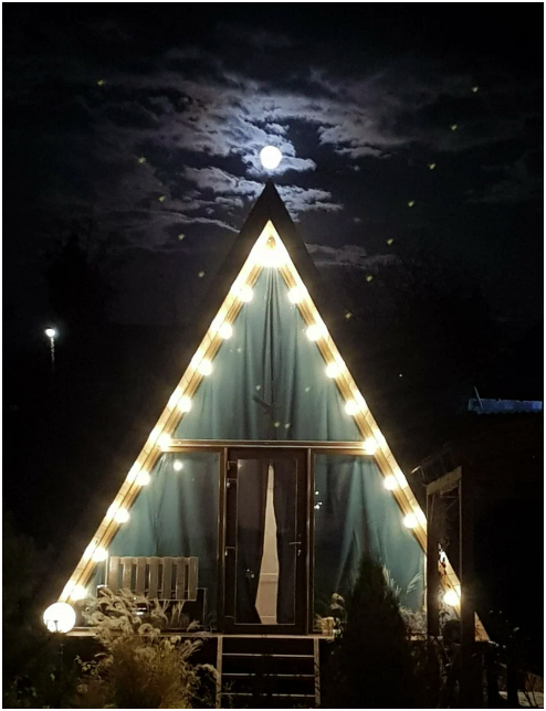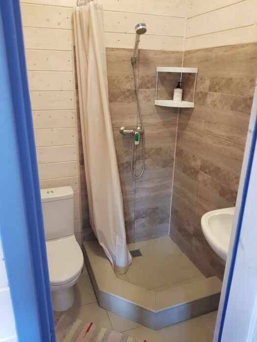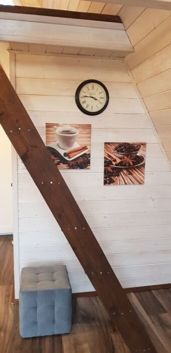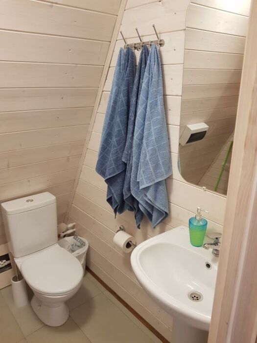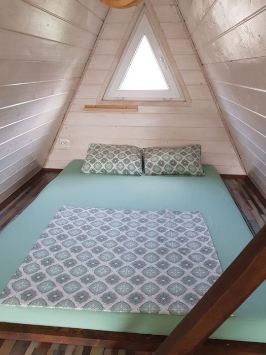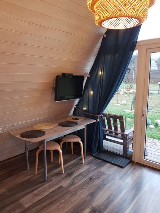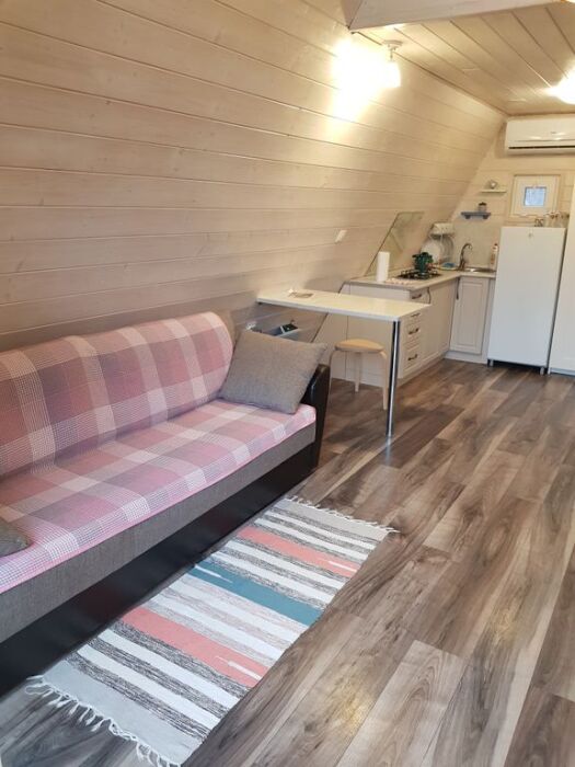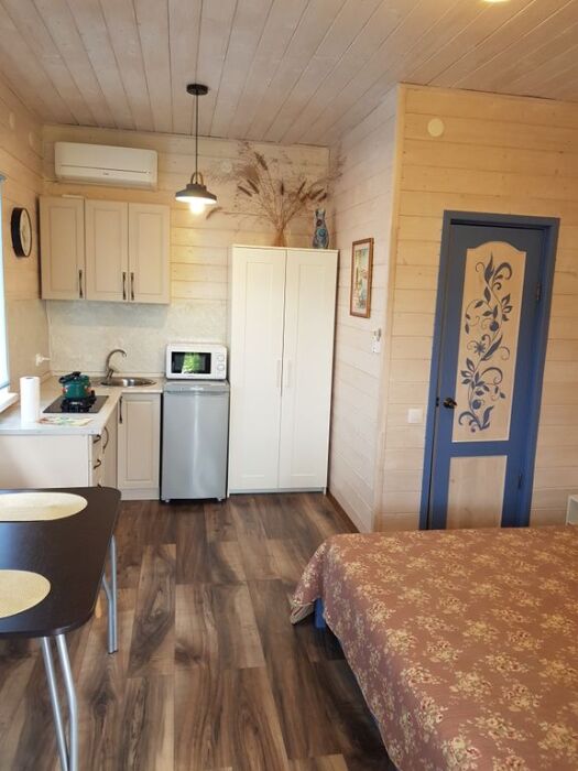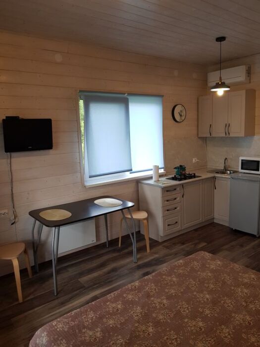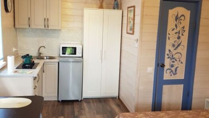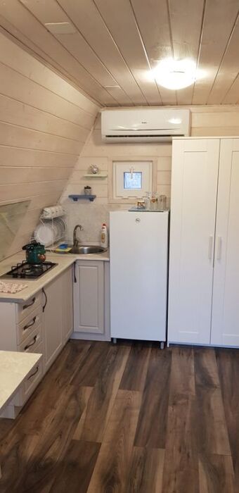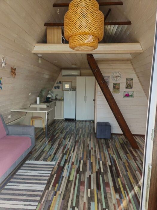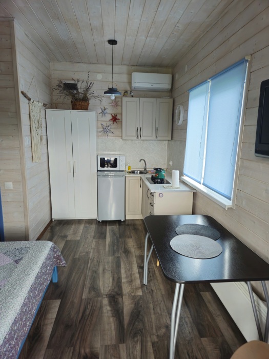 В домике нет раздельных комнат, есть два двуспальных места, на первом и втором этаже, в домике есть сплит система, телевизор, кухонная зона с газовой плитой, микроволновая печь, холодильник, посуда, фен, душ сан узел.