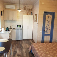 В номере на 2 чел. имеется двуспальная кровать, телевизор, кухонная зона с газовой плитой, холодильник, посуда, фен, душ, сан узел, сплит-система.
