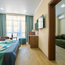 В номере имеется балкон с мебелью (стол и стулья), одна двуспальная кровать, две односпальных кровати, два кресла-кровать, шкаф, журнальный столик, туалетный столик , рабочий стол, холодильник, стулья, панорамное окно.