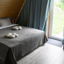 Хоромы Крестьянской Усадьбы располагают восемью спальнями, гостиной с сейфом, большим кондиционером и буфетом, холодильником, микроволновой печью, TV и обеденным столом, а также мангальной зоной и верандой с видом на небольшой пруд.