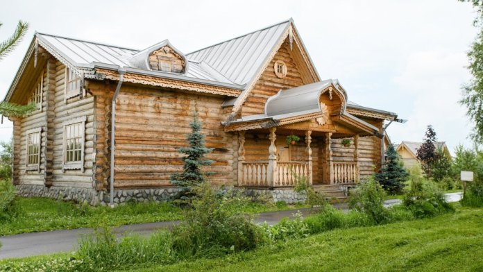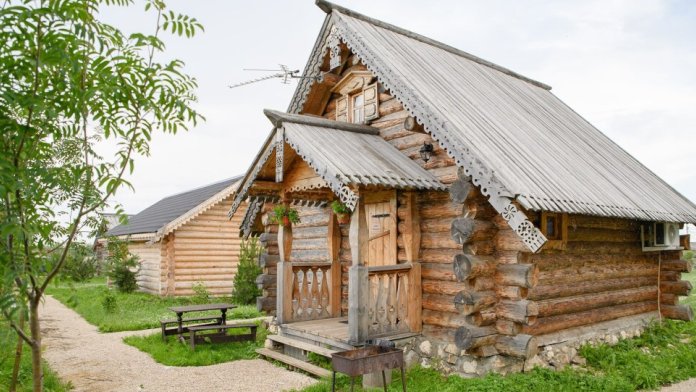 Отдельно стоящий дом из бревна с теплыми полами, санузлом, дизайнерский интерьер в стиле русских традиций, мангальная зона, стол, лавочки возле горницы.