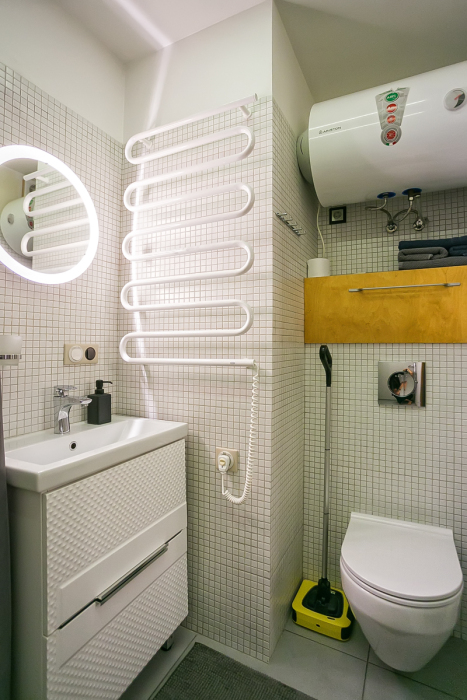 Есть все необходимое для комфортного проживания: стиральная машина, посудомоечная машина, бойлер (горячая и холодная вода круглосуточно), кондиционер, теплый пол (в зимнее время и межсезонье), фен, утюг, гладильная доска, полотенца, постельное белье, посуда для принятия и приготовления пищи, холодильник, чайник, микроволновка