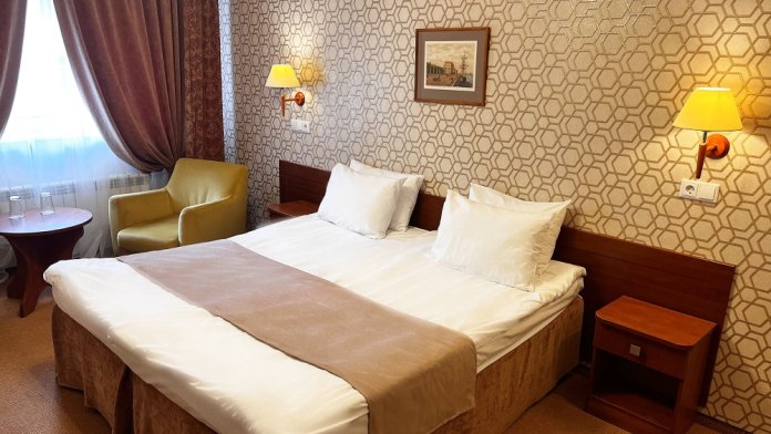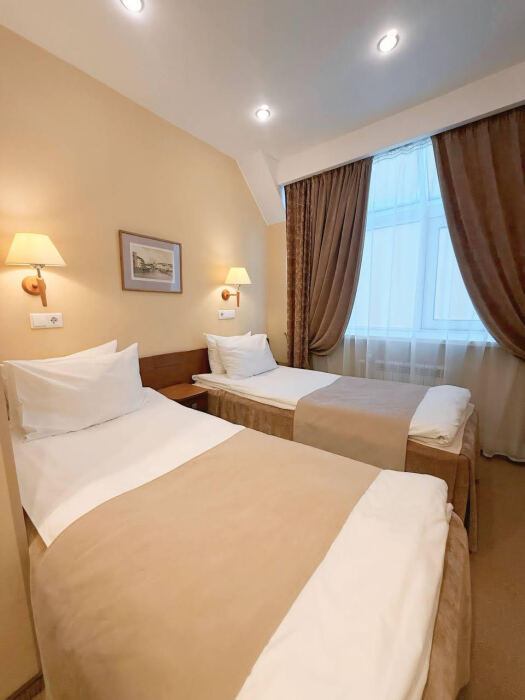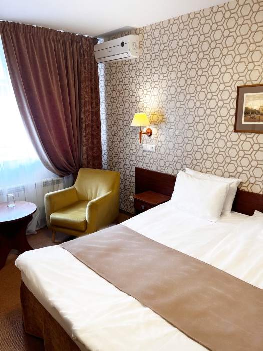 Двухместные номера стандартной планировки находятся на 3-ем и 4-ом этажах. Площадь номера от 18,5 до 21 кв.м. Двуспальная или две односпальных кровати. Номер оборудован: феном, встроенным холодильником, телевизором, письменным столом с письменными принадлежностями.