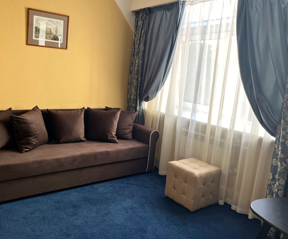 Семейный люкс – это двухкомнатный, отлично меблированный номер с балконом, площадью 44 кв.м. Просторная гостиная с диваном (двуспальным, раскладывающимся) журнальным столиком и креслами, спальня с большой двуспальной кроватью и ванная комната с полноценной ванной. В номере могут комфортно расположиться от одного до четырех человек, есть возможность установки дополнительной кровати для взрослого или ребёнка.
