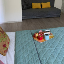 В квартире удобная кровать 140×200 см с ортопедическим матрасом и удобные гиппоалергенные подушки.