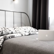 В студии есть все необходимое для проживания: кровать с ортопедическим матрасом, белоснежное постельное белье, полотенца, шкаф для одежды, письменный и обеденный столы. Кухонный гарнитур со всей техникой, холодильник, микроволновка, вытяжка, посуда. Имеется утюг, гладильная доска, стиральная машинка, фен. Шторы блэкаут, не пропускающие свет. Консьерж, охрана.