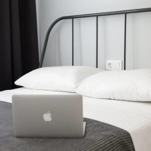 В студии есть все необходимое для проживания, кровать с ортопедическим матрасом, белоснежное постельное белье, полотенца, шкаф для одежды, письменный и обеденный столы. Кухонный гарнитур со всей техникой, холодильник, микроволновка, вытяжка, посуда. Имеется утюг, гладильная доска, стиральная машинка, фен. Шторы блэкаут, не пропускающие свет. Консьерж, охрана.