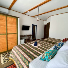 В номере одна большая двуспальная кровать и один диван-кровать для возможного дополнительного размещения третьего человека, балкон с панорамными окнами, душевая с туалетом, кондиционер, холодильник, спутниковое телевидение, сейф, банные и пляжные полотенца,фен, косметика для личной гигиены премиум класса, сланцы для взрослых, wi-fi, электронный замок на входной двери.