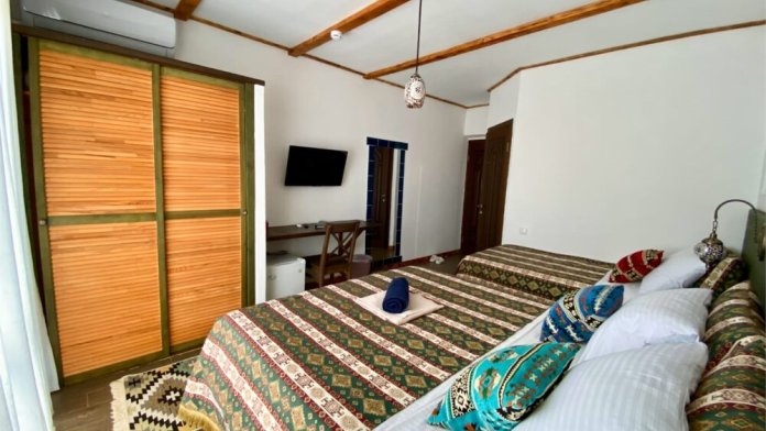 В номере одна большая двуспальная, одна полутороспальная и одна приставная односпальная кровати, балкон с панорамными окнами, душевая с туалетом, кондиционер, холодильник, спутниковое телевидение, сейф, банные и пляжные полотенца,фен, косметика для личной гигиены премиум класса, сланцы для взрослых, wi-fi, электронный замок на входной двери.