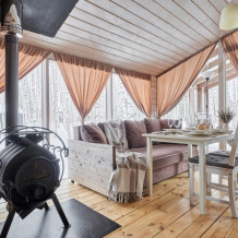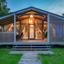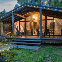 Дом для комфортного семейного отдыха на 2 - 4 человека. Общая площадь 85 кв.м (25 терраса и 60 кв.м. основная жилая площадь из двух комнат и 2х террас). У вас в распоряжении кухонная зона, душ, туалет, зал, разделённый ширмой на спальню и гостиную, есть кондиционер, печь-камин, система автоматического поддержания температуры, шторы блэкаут.