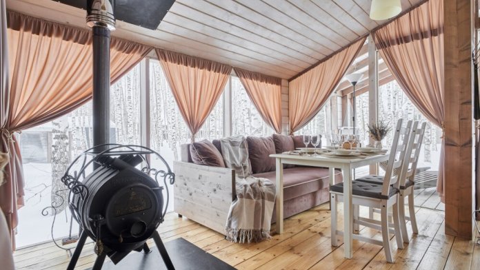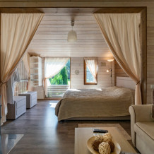 Дом для комфортного семейного отдыха на 2-4 человек. Общая площадь 60 кв.м (24 терраса и 36 кв.м. основная жилая площадь). У вас в распоряжении кухонная зона, ванная комната с тёплыми полами, туалет, общая комната с двуспальной кроватью и дополнительным спальным местом, отделённым ширмой, печь-камин, система автоматического поддержания температуры, шторы блэкаут.