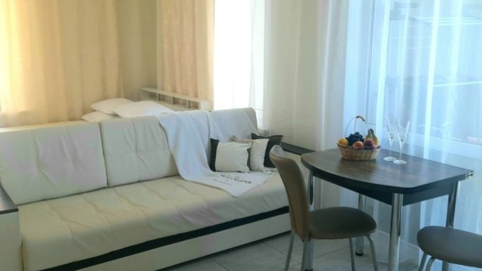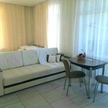 Просторная светлая студия оборудована всем необходимым для отдыха - двуспальная кровать, односпальный диван и двуспальный диван плюс раскладушка, в ванной есть стиральная машина, фен, гладильные принадлежности, кухня оборудована варочной панелью, большим холодильником, микроволновкой и чайником.
