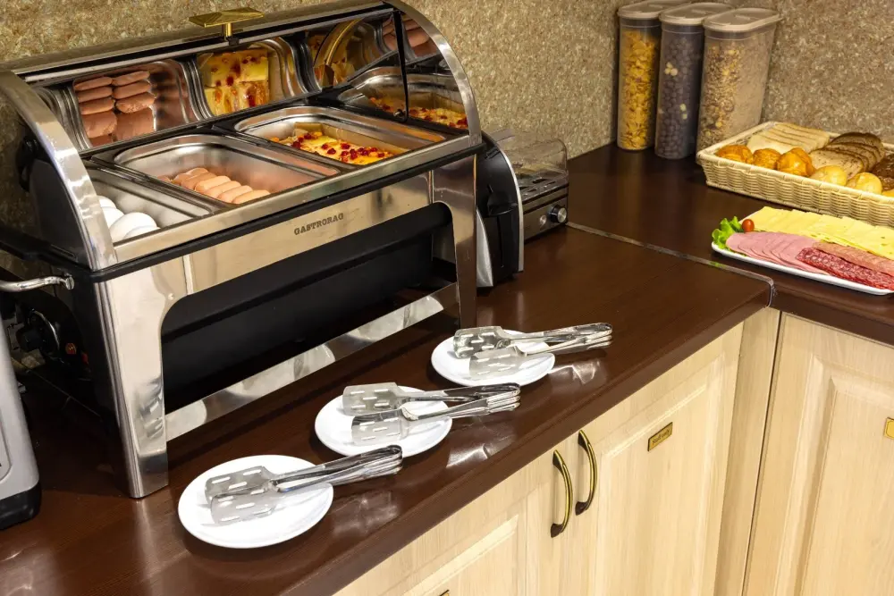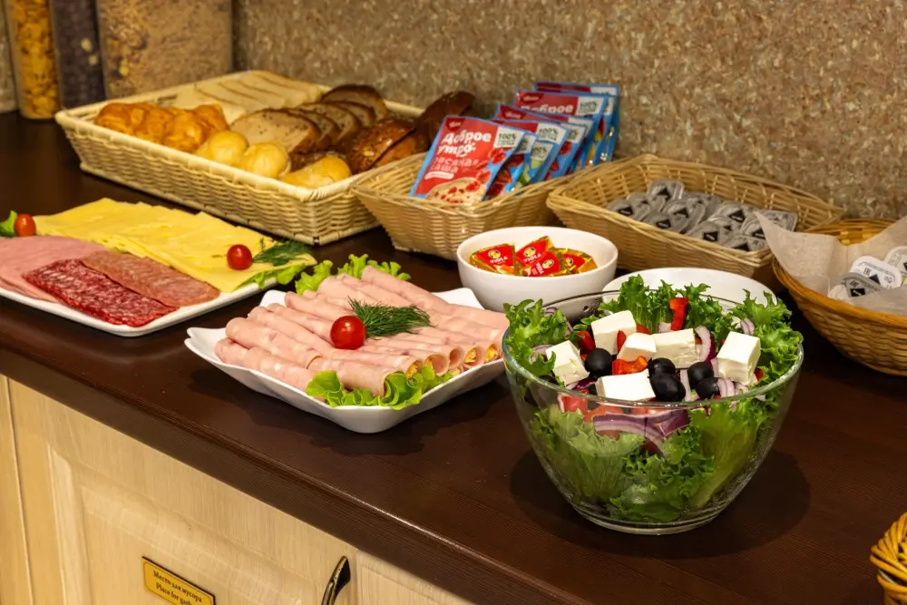 Каждое утро для гостей сервируется завтрак в кафе. По желанию, блюда можно доставить в номер.