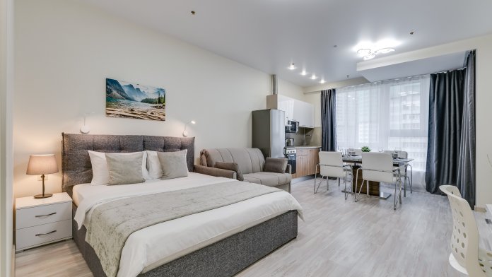 - Двуспальная кровать и раскладной диван. Белоснежное постельное бельё;