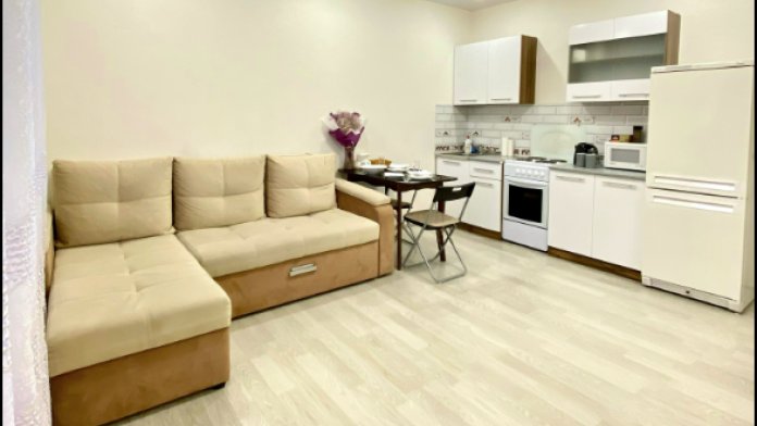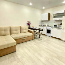 Квартира оснащена необходимой мебелью и техникой для комфортного проживания: 2 дивана (постельное бельё), стол, телевизор Smart с выходом в интернет, WI-FI, холодильник, микроволновая печь, электрическая плита, электрический чайник, столовая посуда и приборы, стиральная машина, комплект банных полотенец, фен, утюг, гладильная доска, сушилка, кондиционер.