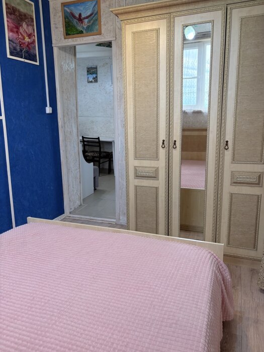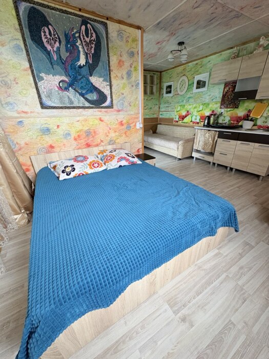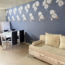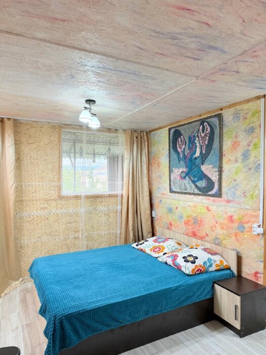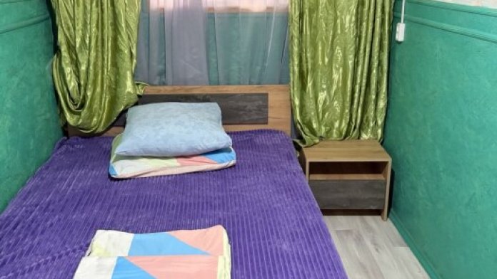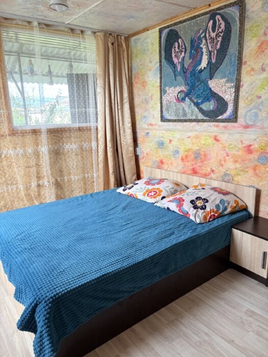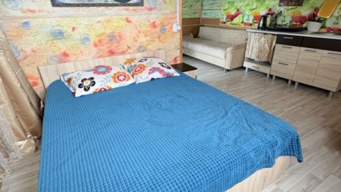В комнате располагается 2-х спальная кровать, раскладной диван, вместительный шкаф, прикроватная тумба, два больших окна и кондиционер. На кухне есть посуда, холодильник и плита. Санузел совмещенный с душем.