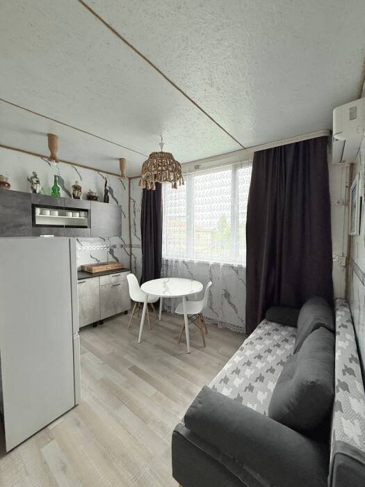 Уютная студия оборудованная всеми удобствами, включая кухню, а также балкон с видом на сад. В комнате находится 2-спальная кровать, раскладной диван, кресло, шкаф, прикроватная тумба, кондиционер. На кухне есть посуда, холодильник и плита. Подойдет для семейного отдыха.