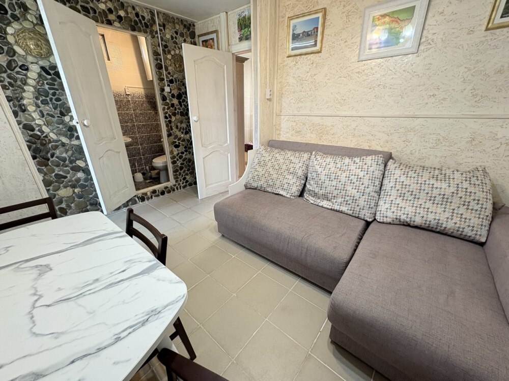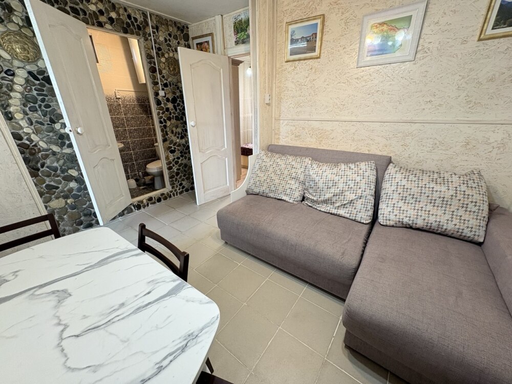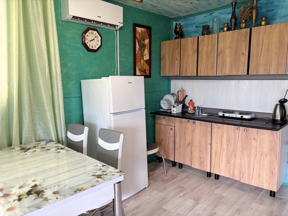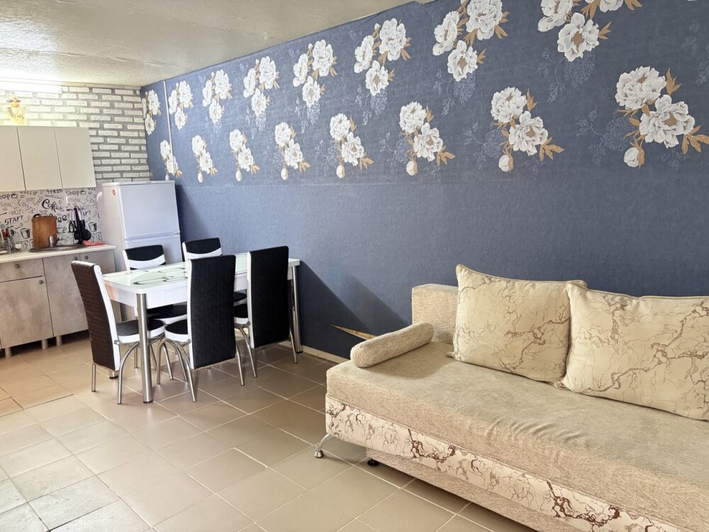 Уютная студия оборудованная всеми удобствами, включая кухню, а также балкон с видом на сад. В комнате находится 2х-спальная кровать, раскладной диван, диван, шкаф, прикроватная тумба, кондиционер. На кухне есть посуда, холодильник и плита. Подойдет для семейного отдыха.