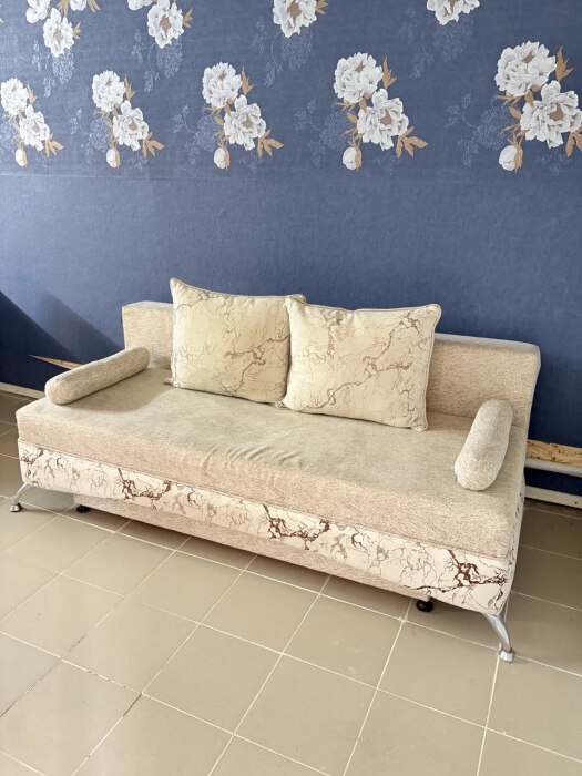 2-спальная кровать, раскладной диван, кресло, шкаф, прикроватная тумба, кондиционер. На кухне есть посуда, холодильник и плита. Санузел совмещен с душем.