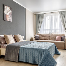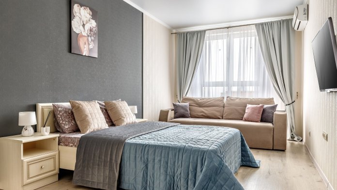 Просторная комната с большой двуспальной кроватью, прикроватными тумбами, уютным диваном, телевизором и стильным журнальным столиком. Уютная кухня с обеденным столом, стульями, современным кухонным гарнитуром, электроплитой, холодильником, микроволновой печью, электрочайником, посудой и всем необходимым для приготовления вкусных блюд. Современный санузел с ванной, стиральной машиной, туалетными принадлежностями и феном, чтобы Вы всегда выглядели на высоте. Беспроводной Wi-Fi и кабельное телевидение, чтобы быть всегда на связи и наслаждаться любимыми телепередачами. Гладильная доска и утюг для поддержания безупречного внешнего вида. Всегда свежее постельное белье, чтобы Вы могли наслаждаться комфортом и отдыхать с настоящим удовольствием.