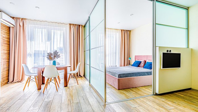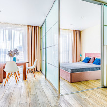 Апартаменты состоят из гостиной комнаты объединенной с кухонной зоной и отдельной спальней. В спальне двуспальная кровать с ортопедическим матрацем, 2 прикроватные тумбы, светильник. В гостиной стоит угловой двуспальный диван, жк телевизор, кухонный гарнитур, обеденный стол и стулья. Всегда заправлен комплект чистого постельного белья. В ванной комнате мы подготовили для Вас шампунь, гель для душа, зубную пасту и жидкое мыло. А также мягкие банные полотенца и тапочки. В квартире проведен скоростной Wi-Fi интернет, чтобы Вы могли всегда оставаться на связи.