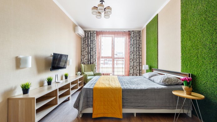 - Просторная комната с большой двуспальной кроватью, прикроватными тумбами, уютным диваном, телевизором и стильным журнальным столиком.