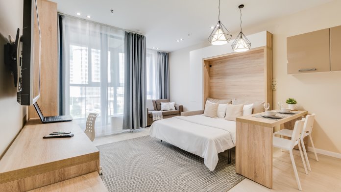 - Двуспальная кровать и раскладной диван. Белоснежное постельное бельё;