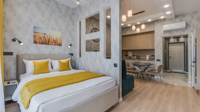 - Двуспальная кровать и раскладной диван. Белоснежное постельное бельё;