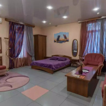 В номере ванная (халат, полотенца, тапочки, гигиенические принадлежности), раздельный санузел. Также диван, кресло, кофейный столик, шкаф для одежды и комод.